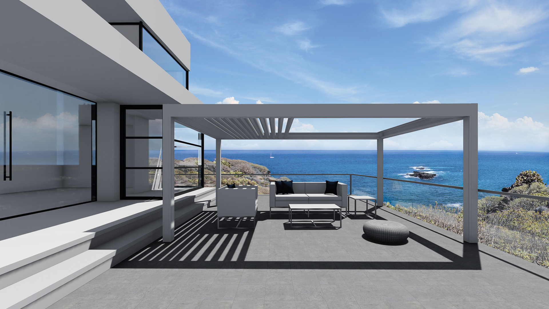 Lamellendach mit geöfneten Lamellen und halb abgesenktem ZIP-Screen