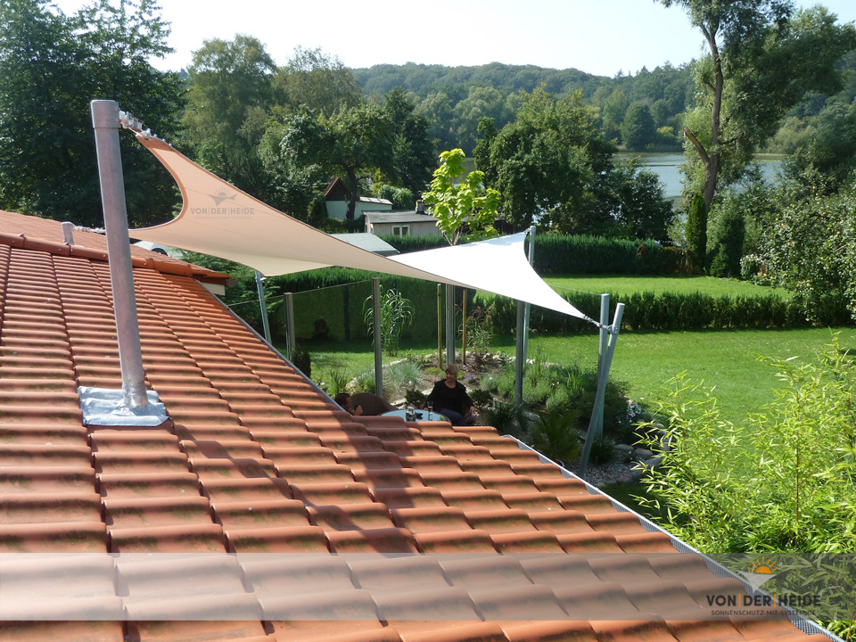 Großes Fünfpunkt-Saisonsegel mit Dachmontage und Robinienmasten