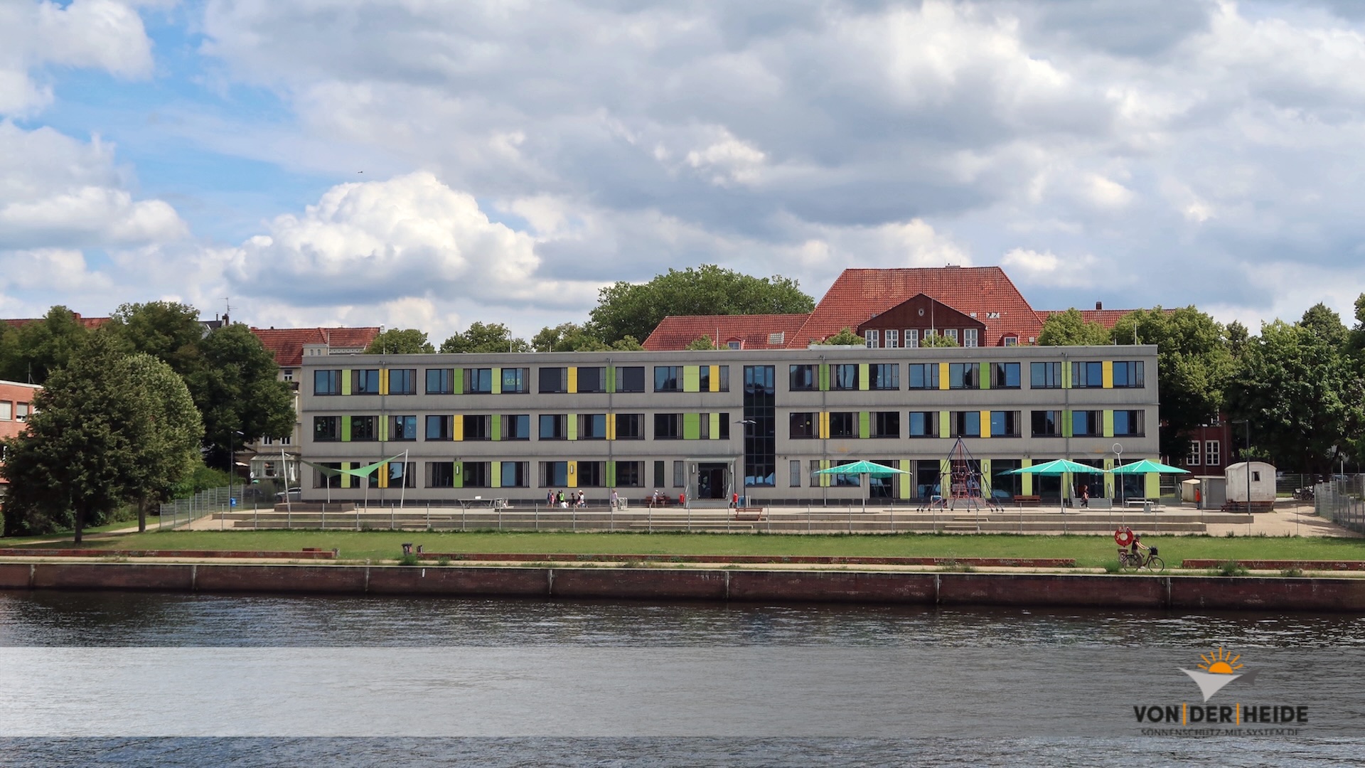 Aufrollbares Sonnensegel in einer Kita über Rutsche auf Dachterrasse in Bremen