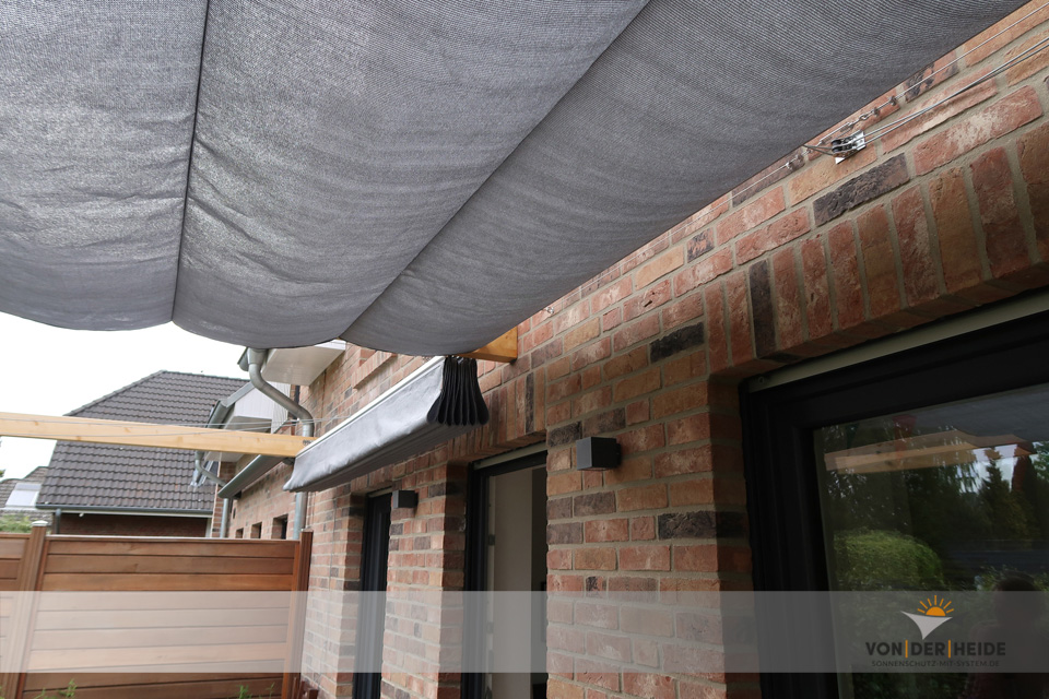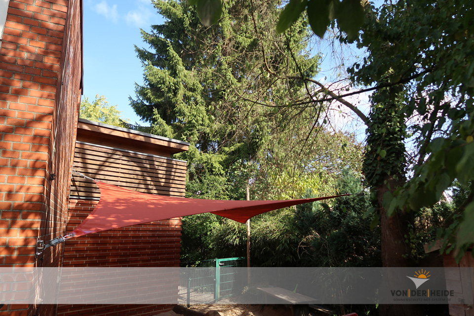 Sonnenschutz- und Wetterschutzsegel an einem Rotklinkerhaus in Lübeck