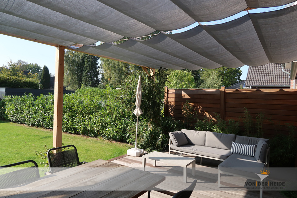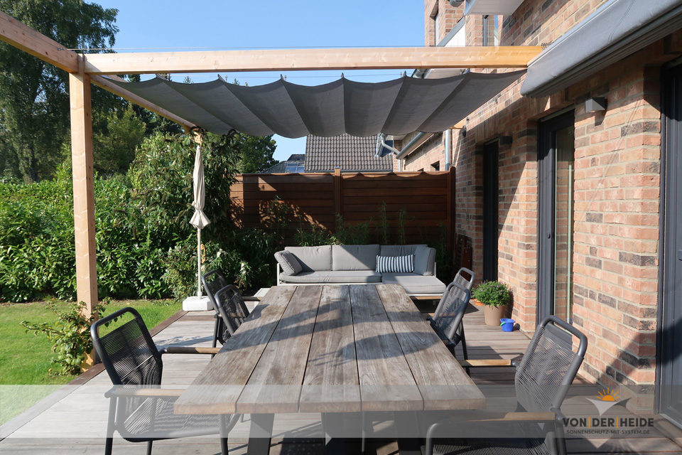 Luftiger Platz unter einem Raff-Sonnensegel – ob Essplatz oder Lounge