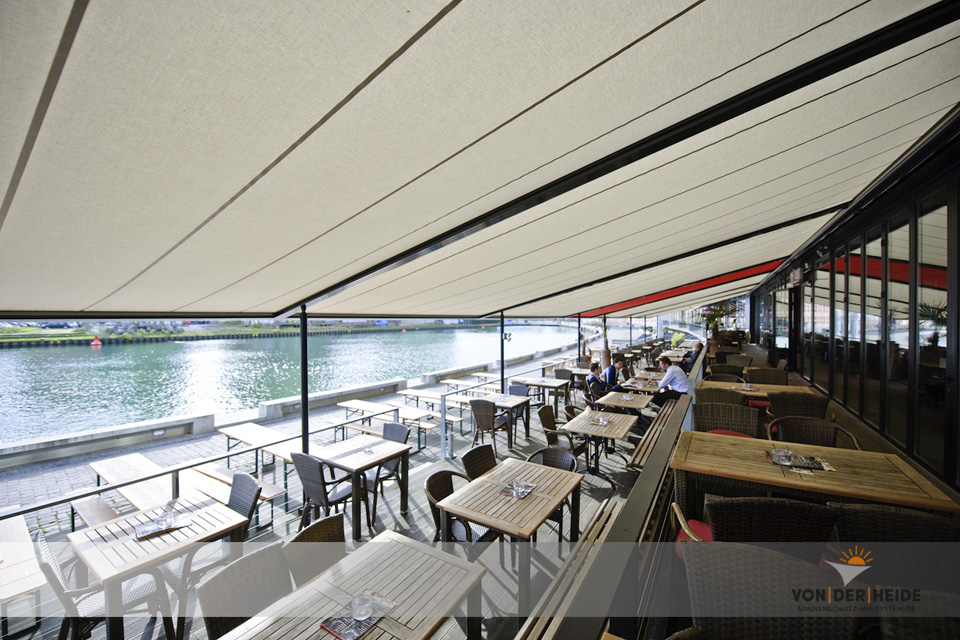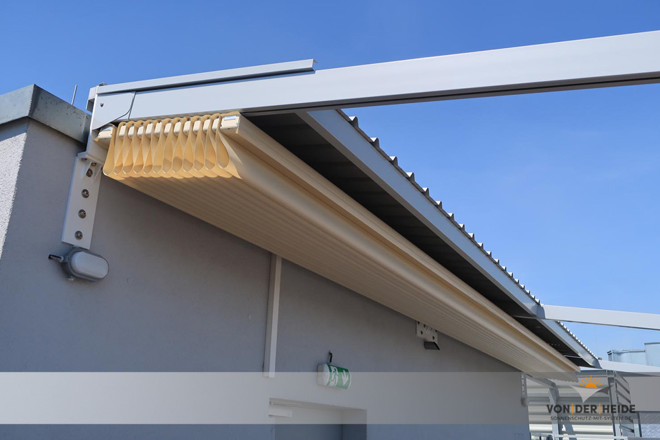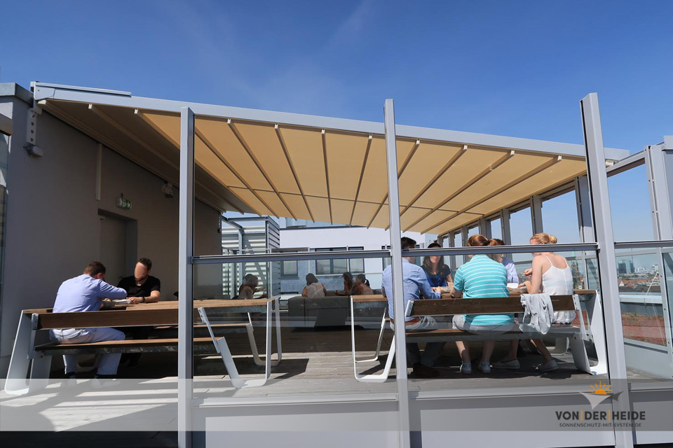 Pergola-Markise auf Dachterrasse einer Firma in Hamburg mit einseitiger Höhenabsenkung