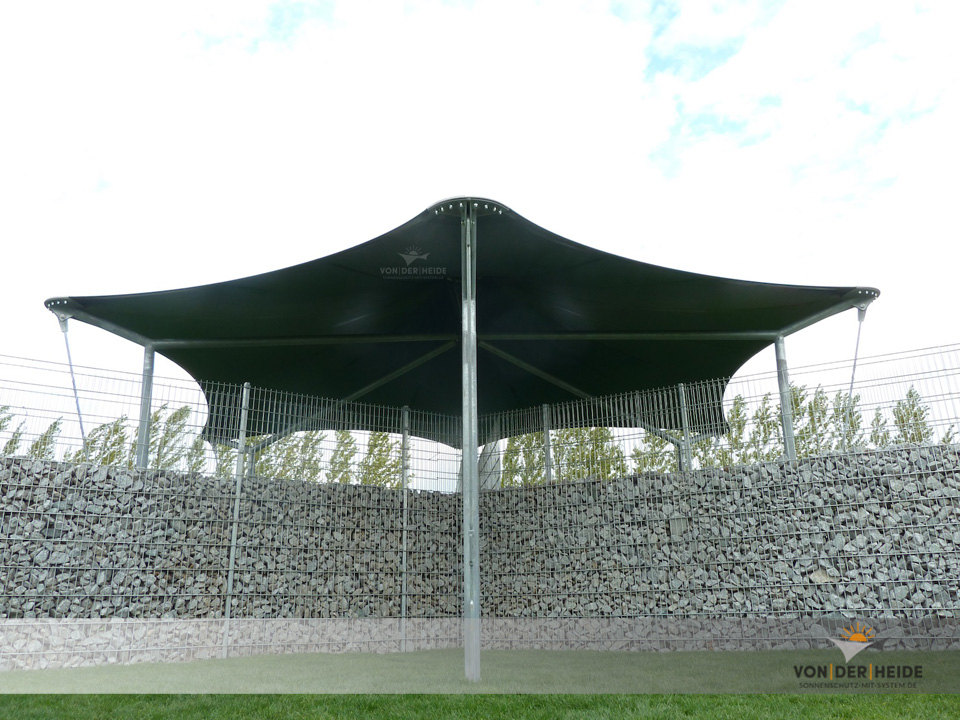 Großes Fünfpunkt-Saisonsegel mit Dachmontage und Robinienmasten. Hyparform