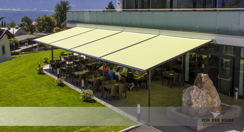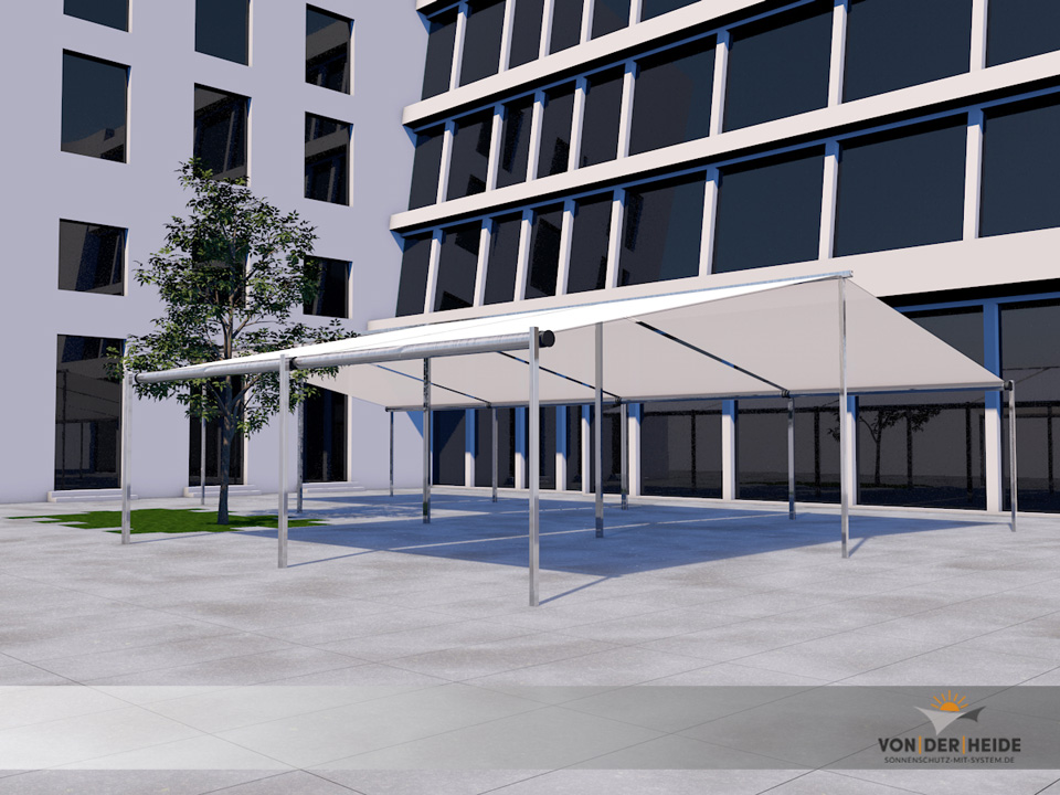 Schwebe- oder Pergola-Markise Markilux in weissaluminium an einem Aufenthaltsbereich eines Gewerbebetriebes