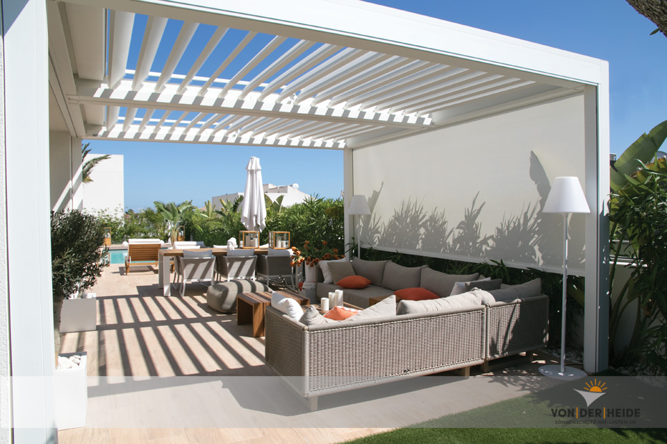 Terrassendach mit kippbaren Lamellen und seitlichen Senkrechtmarkisen (Zip-Screens)
