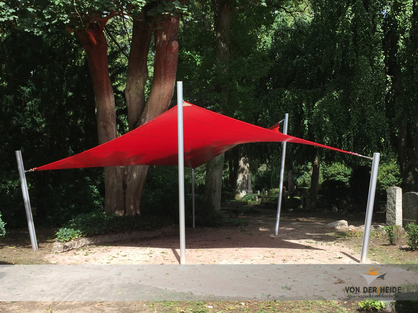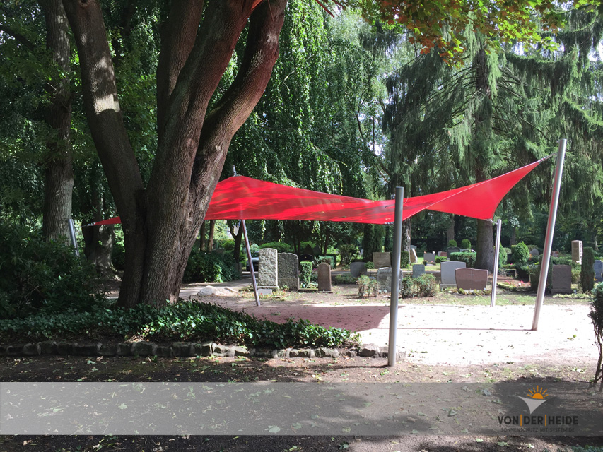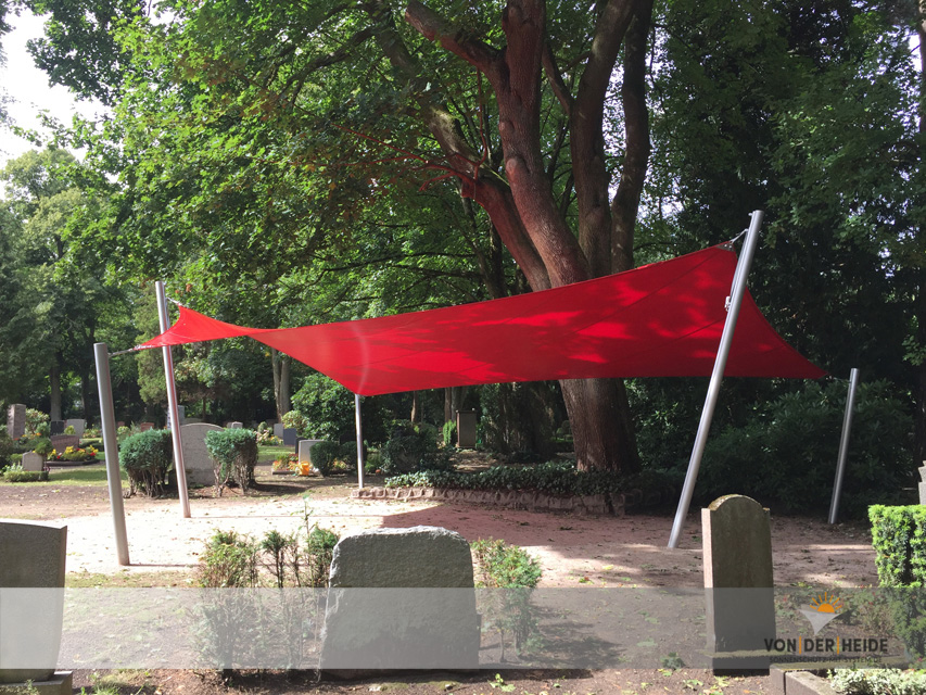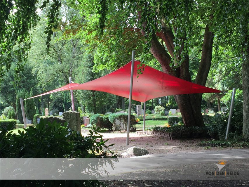 Das rote Sonnen- und Wetterschutzsegel bietet Schutz für Trauergäste